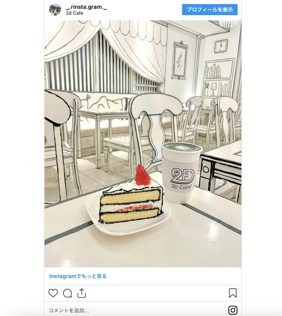 モノトーンの店内は目の錯覚で2Dに見えるだけでなく、ケーキも2次元みたいな工夫が施されているので、異世界のような写真が撮れます。